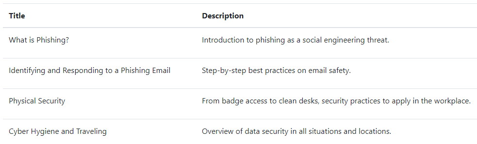 The Courses page gives you an overview of the training courses available to assign to your users. Each Course includes a Video packaged with a 3-question quiz. Once the user finishes the video, they will get to answer the quiz, receiving real-time feedback as they get answers right or wrong. Users must correct their wrong answers and get 100% to complete each course assignment.